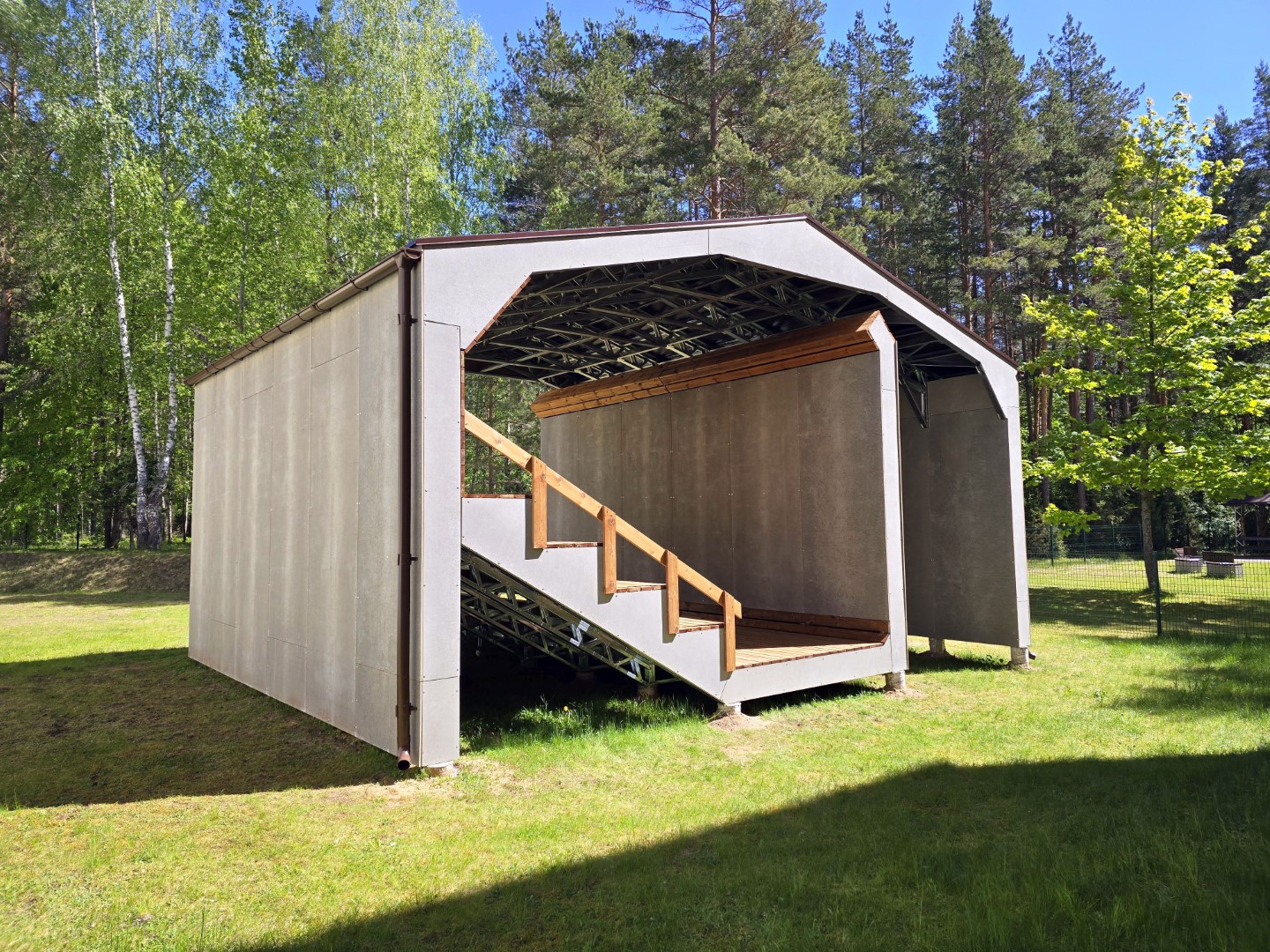 - Cinkuotas plienas – pagrindinė konstrukcijos medžiaga, užtikrinanti ilgaamžiškumą ir atsparumą korozijai. Cinkuotas plienas yra idealus pasirinkimas lauko sąlygoms, nes jis suteikia papildomą apsaugą nuo rūdijimo ir aplinkos poveikio.